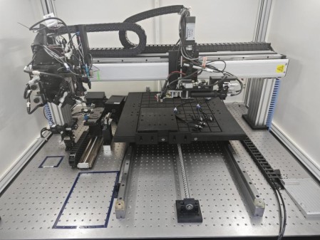 | 設(shè)備功能:實(shí)現(xiàn)對(duì)FAC的自動(dòng)化拾取、姿態(tài)識(shí)別、光斑耦合、點(diǎn)膠及UV固化,設(shè)備具備米級(jí)的運(yùn)動(dòng)行程和納米級(jí)耦合能力。 |